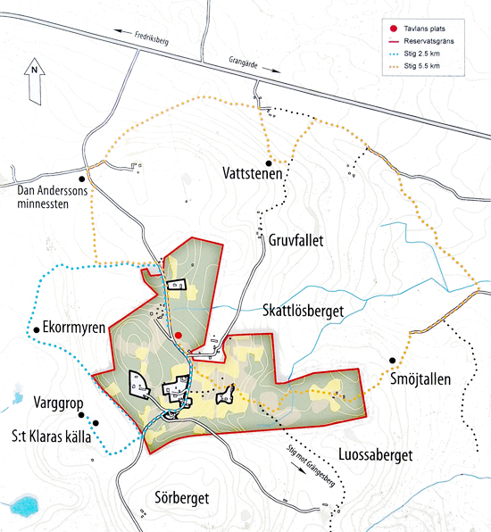 Runt naturreservatet Skattlösberg finns två markerade vandringsleder. På vägen runt kan du läsa mer om sevärdheterna. Den orange markerade slingan är 5,5km lång och den blå markerade är 2,5km lång. Ska du gå den blå slingan kan det vara bra med skor som tål lite vatten. Här får du vägbeskrivning: Google visar vägen hit Källa: Tavlan på plats, Länstyrelsen Dalarna |