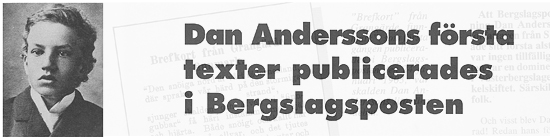 Och visst blev Dan Andersson publicerad! Redan hans första alster uppmärksammades när det det kom i tryck den 24 januari 1903. Vinjetten för hans epos var "Brefkort från finnmarken", och skulle bli återkommande i Bergslagsposten under flera år. Chefredaktören J. F. Nelson på Bergslagsposten kommenterade hans debut kort och koncist i sin kolumn: "D.A. Tack och välkommen åter"! Ett erkännande som inte många förstagångsskrivare var förunnade. Vad Nelson inte visste var, att bakom pennan dolde sig en blott 14-årig yngling i de djupaste av finnmarksskogar. Om åldern på skribenten varit känd, hade det kanske inte blivit någon debut! Brefkort från Grangärde finnmark "Den snöiga nord är vårt fädernesland, där sprakar vår härd på den stormiga strand", sjunger skalden och äfven vi "finn- gubbar" få häri instämma med själ och hjärta. Både snöigt och kallt har det blifvit på allvar, och det tjutes under medar och smälles i knutar och går an riktigt på vintervis. De gångna hälgdagarna, jul och nyår, tilländalupo i allsköns lugn och ro häruppe, åtminstone å underteck- nads hemort. Fylleri och bråk ute- blefvo, hvilket annars brukar utgöra det sensationela under högtidsdagar häruppe. Sorgligt nog ha juldagarna plägat mera injaga skräck och mot- vilja hos nyktert och anständigt folk i stället för att medföra glädje. Slags- mål har man fått åse, vilddjurs-skrän har man fått höra, kort sakt, man har som uppbyggelse brukat få bevitna de mäst skräckinjagande scener, fått höra de hemskaste afgrundsskrål, allt för ingenting. Hoppas dock att ingen annan afundas oss bärgslagsbor dessa förmåner! Men, som sakt, den gångna hälgen var ovanligt fridsam, hvilket vi hanske, åtminstone till någon del, ha de talrika nykterhetsföreningarna, som här och hvar förekomma, att tacka för. Sparkstöttingsåkandet och skidlöpan- det är ganska modärnt bland befolk- ningen häruppe, och finnes det knap- past någon enda som ej är "sportsman" i våra bygder. Hvarenda skolpojke har sina skidor med, eller sin spark- stötting, och är det ett ganska lifligt "sportande" på hemvägar under fri- stunder, hvilket ju också å sin sida är en god sak. Ja, tillgrepe ungdomen al- drig mindre oskyldiga förströelser, så skulle nog allt bråk om dess s. k. demoralisation snart försvinna. Mera en annan gång. Au revoir! D. A. Källa: Jubileumsbilaga av Bergslagsposten 1992, reportaget gjordes avJan-Olof Schröder |