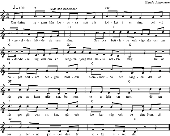 Stugan kallas för Luossastugan efter Dan Andersson dikt "Tiggaren från Luossa" namnet kommer av bergen strax söder om gården , Luosaberget. Länkar i sammanhanget: 🔹Dan Andersson 1888-1920 🔹Dan Andersson första texter 🔹Gamla skolan Skattlösberg 🔹Luossastugan i Skattlösberg 🔹Pajso - platsen som inspirerade Dan Andersson 🔹Dan Andersson vän Verner Berglund bodde här 🔹Adolf Andersson (Dan Anderssons far) 🔹Adolf Anderssons "papper" 1873 byggdes huset som står där idag av Lars Jansson, och fick namnet MossLasses. 1887 eller 1888 såldes gården till skräddare Anders Hedlund och då fick gården namnet Skräddartorpet, ett namn som gården behållit ända till bygdegillet tog över gården och gjorde om den till minnesstuga. Här bodde nu Dan Andersson ensam sommaren 1911 för att skriva sina dikter och noveller. Han hjälpte även till i slåtterarbetet i Skattlösberg under sommaren. 1912 flyttade Adolf Andersson med familj in i stugan och bodde där till juni 1915. Stugan har även använts som övernattningsstuga åt arbetarna som byggde Fredriksbergsvägen. Idag ägs stugan av privatpersoner men skattlösbergs Bygdegille som tog över stugan 1944 underhåller stugan och omkringliggande byggnader. Här får du vägbeskrivning: Google visar vägen hit Dikten i sin helhet, "Tiggaren från Luossa" ![]() Texten: Omkring tiggarn från Luossa satt allt folket i en ring, och vid lägerelden hörde de hans sång. Och om bettlare och vägmän och om underbara ting, och om sin längtan sjöng han hela natten lång: Det är något bortom bergen, bortom blommorna och sången, det är något bakom stjärnor, bakom heta hjärtat mitt. Hören - något går och viskar, går och lockar mig och beder: Kom till oss, ty denna jorden den är icke riket ditt Jag har lyssnat till de stillsamma böljeslag mot strand, om de vilda havens vila har jag drömt. Och i anden har jag ilat mot de formlösa land, där det käraste vi kände skall bli glömt. Till en vild och evig längtan föddes vi av mödrar bleka, ur bekymrens födselvånda steg vårt första jämmerljud. Slängdes vi på berg och slätter för att tumla om och leka, och vi lekte älg och lejon, fjäril, tiggare och gud. Satt jag tyst vid hennes sida, hon, vars hjärta var som mitt, redde hon med mjuka händer ömt vårt bo, hörde jag mitt hjärta ropa, det du äger är ej ditt, och jag fördes bort av anden att få ro. Det jag älskar, det är bortom och fördolt i dunkelt fjärran, och min rätta väg är hög och underbar. Och jag lockas mitt i larmet till att bedja inför Herran: Tag all jorden bort, jag äga vill vad ingen, ingen har! Följ mig, broder, bortom bergen, med de stilla svala floder, där allt havet somnar långsamt inom bergomkransad bädd. Någonstädes bortom himlen är mitt hem, har jag min moder, mitt i guldomstänkta dimmor i en rosenmantel klädd. Må de svarta salta vatten svalka kinder feberröda, må vi vara mil från livet innan morgonen är full! Ej av denna världen var jag och oändlig vedermöda led jag för min oro, otro, och min heta kärleks skull. Vid en snäckbesållad havsstrand står en port av rosor tunga, där i vila multna vraken och de trötta män få ro. Aldrig hörda höga sånger likt fiolers ekon sjunga under valv där evigt unga barn av saligheten bo. |
