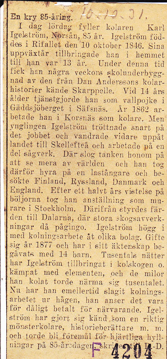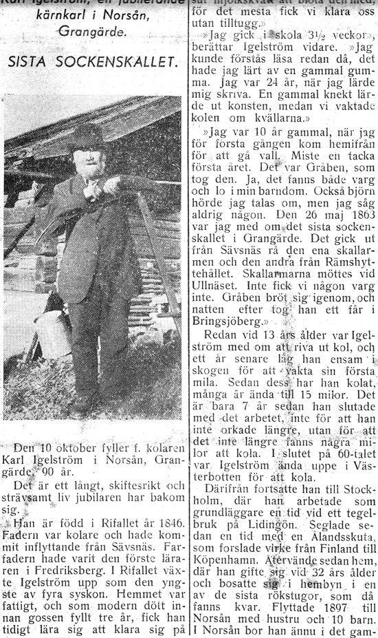 Nedanstående text är renskriven från ett tidningsurklipp (okänd tidning) med rubriken Karl Igelström en jubilerande kärnkarl i Norsån, Grangärde. Den 10 oktober fyller f. kolaren Karl Igelström i Norsån, Grangärde. 90 år. Det är ett långt, skiftesrikt och strävsamt liv jubilaren har bakom sig Han är född i Rifallet är 1846. Fadern var kolare och hade kommit inflyttande från Sävsnäs. Fadern hade varit den förste läraren i Fredriksberg. I Rifallet växte Igelström upp som den yngste av fyra syskon. Hemmet var fattigt, och som modern dött innan gossen fyllt tre år, fick han tidigt lära sig att klara sig på en brödbit och en sur mjölkskvätt att blöta den med för det mesta fick vi klara oss utan tilltugg. Jag gick i skola 3 1/2 veckor, berättar Igelström vidare. Jag kunde förstås läsa redan då, det hade jag lärt av en gammal gumma. Jag var 24 år, när jag lärde mig skriva. En gammal knekt lärde ut konsten, medan vi vaktade kolen om kvällarna. Jag var 10 år gammal, när jag för första gången kom hemifrån för att gå vall. Miste en tacka första året. Det var Gråben, som tog den. Ja, det fanns både varg och lo i min barndom, också björn hörde jag talas om, men jag såg aldrig någon. Den 26 maj 1863 var jag med om det sista socken-skallet i Grangärde. Det gick ut från Sävsnäs rå den ena skallarmen och den andra från Rämshyttehållet. Skallarmarna mõttes vid Ullnäset. Inte fick vi någon varg inte. Gråben bröt sig igenom, och natten efter tog han ett får i Bringsjöberg. Redan vid 13 års ålder var Igelström med om att riva ut kol, och ett år senare ligger han ensam i skogen för att vakta sin första mila. Sedan dess har han kolat, många år ända till 15 milor. Det är bara 7 år sedan han slutade med det arbetet, inte för att han inte orkade längre, utan för att det inte längre fanns några milor att kola. I slutet på 60-talet var Igelström ända uppe i Västerbotten för att kola Därifrån fortsatte han till Stockholm, där han arbetade som grundläggare en tid vid ett tegelbruk på Lidingön. Seglade sedan en tid med en Ålandsskuta, som forslade virke från Finland till Köpenhamn. Återvände sedan hem, där han gifte sig vid 32 års ålder och bosatte sig i hembyn i en av de sista rökstugor, som då fanns kvar. Flyttade 1897 till Norsån med hustru och 10 barn. I Norsån bor han ännu i det gamla brukets snart 200-åriga smedstuga. Ett snart 60-årigt äktenskap har skänkt makarna 14 barn, av vilka 11 äro i livet, den den äldste sonen 58 år och den yngste 33 år. Igelström är än i dag frisk och kry som en 60-åring. Den 20 september gick han 7 km för att lägga sin röst i valurnan, säkert en av de allra äldsta väljarna 1936. Han sköter själv det lilla torpet samt sin ko utan främmande hjälp. Igelström framstår för alla dem som känner honom, som en representant för den strävsamma, idoga generation, som varit med och lagt grunden till det välstånd och den kultur, som vi nu alla njuta frukterna av. Och säkert är, att på sin högtidsdag kommer att få mottaga många bevis på vänskap och tacksamhet. ![]() När Karl fyller 85 år, finns även då ett tidningsurklipp från Dala Demokraten 10/10-1931 med nedanstående text. Idag lördag fyller kolaren Karl Igelström, Norsån, 85 år. Igelström föddes i Rifallet den 10/10-1846. Sina uppväxtår tillbringade han i hemmet till han var 13 år. Under denna tid fick han några veckors skolunderbyggnad av den från Dan Anderssons kolar-historier kände SkarpPelle. Vid 14 års ålder tjänstgjorde han som vallpojke i Gäddsjöberget i Säfsnäs. År 1862 arbetade han i Korsnäs som kolare. Men ynglingen Igelström tröttnade snart på det jobbet och vandrade vidare uppåt landet till Skellefteå och arbetade på en del sågverk. Där slog tanken honom på att se mera av världen, och han tog därför hyra på en lastångare och besökte finland, Ryssland, Danmark och England. Efter ett halvt års vistelse på böljorna tog han anställning som murare i Stockholm. Därifrån styrdes färden till dalarna, där stora skogsavverkningar då pågick. Igelström högg i med kolningsarbete åt olika bolag. Han gifte sig år 1877 och har i sitt äktenskap begåvats med 14 barn. Tusentals nätter har Igelström tillbringat i kolskogen och kämpat med elementen, och de milor han kolat torde närma sig tusentalet. Nu har han emellertid slagit kolningsarbetet ur hågen, han anser det vara för dåligt betalt för närvarande. Igelström har gjort sig känd som en riktig mönsterkolare, historieberättare m.m. och torde bli föremål för hjärtliga hyllningar på sin 85-årsdag. ![]() |