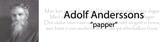 Nils Holmdal, skriver här och berättar att hans svärfar Tore Littmarck från Vänge, har gått igenom Adolf Anderssons antecknings- och klippbok och numrerat upp dessa till nästan 600 sidor. Adolf Andersson lämnade efter sig en mängd dokumentation om allt mellan himmel och jord. Här finns skildringar av personlig nöd, predikningar, föreläsningar i geografi, recept på hemgjorda dekokter, debatt om kvinnliga präster och mycket mycket mer. Detta har nu blivit historien om Adolf Anderssons "papper". Denna samling är nu donerad av hans anhöriga till Länsmuséet i Falun. Länkar i sammanhanget: 🔹Dan Andersson 1888-1920 🔹Dan Andersson första texter 🔹Gamla skolan Skattlösberg 🔹Luossastugan i Skattlösberg 🔹Pajso - platsen som inspirerade Dan Andersson 🔹Dan Andersson vän Verner Berglund bodde här 🔹Adolf Andersson (Dan Anderssons far) 🔹Adolf Anderssons "papper" På första sidan i denna samling har Adolf skrivit följande: "Denna bok må icke säljas, utan förvaras i slägten, och må ingen af mina efterkommande förmenas att läsa i den, om så önskas af någon. Ingen må betrakta den som sin enskilda egendom, sedan jag och min hustru gått ur tiden. Min hustru skall ha den i förvar, så länge hon lefver, om hon öfverlever mig, hvilket jag hoppas Gud må låta ske". Adolf Andersson var en flitig tidningsläsare och följde med i världshändelserna. Han skriver intressanta kommentarer i sina "papper" om de olika ministärerna och hur de handskades med Sveriges intressen under första världskriget. Han skriver "Att vi skulle komma i sådant elände hade sin orsak i att vår regering skeppade under Hammarskiölds borgarregering förnödenheterna till Tyskland. Då engelsmännen hade förklarat Tyskland i blockad och vi ändå bröt däremot, så stängde de vår sjöfart från vester. När vi alltså skeppat ut våra förnödenheter till Tyskland och stängdes från import vesterifrån, så togo förråden slut". Han beskriver också problemen hemmavid med bristen på livsmedel under krigets senare skede "Vi hade intet kaffe, intet tobak, icke té men surrogat. År 1918 rasade spanska sjukan förskräckligt. Mest ungt kraftfullt folk dog. Vi hade nog känning av den." Adolf han beskriver många små vardagliga saker som händer i hans liv. Han köpte bla en hatt till sin fru för 2 kr och 25 öre den 28 maj 1904. Det var den första hatt han köpt henne och de hade ändå varit gifta i 22 år. 1906 vid jultid, är Adolf bekymrad hemma på Mårtenstorp. Det är yrväder och snön faller tätt, och ännu inget slädföre. Han har sagt upp arrendet på torpet och vet inte ännu vart de skall ta vägen. Han är också skyldig pengar, 200 kr till Karl Ersson i Skattlösberg. Men 1923 då skriver han i sina papper om livet som glad pensionär i Gräsberg dit de flyttat. Han ska snart fylla 69 år och är glad att de nu har ett eget hem och pension som räcker till att fylla deras behov. Adolf Andersson var en av de många övertygelsernas man. En av hans mest hyllade teser var att "synden straffar sig själv". Han var på sitt sätt en moraliserande profet och i botten av hans övertygelse fanns förvissningen om att brott aldrig ska löna sig, i varje fall inte i längden. Adolf han hänvisar ofta till Bibeln när han skriver ner sina funderingar. 1904 skriver han en intressant analys som tolkar hans syn på Guds vrede och kärlek och dessutom är en svidande kritik både av Svenska kyrkan och olika företeelser inom väckelsen. Rubriken "Olikheter vid ordets förkunnande". Adolf var en konservativ nytänkare i mångt och mycket. Han tänkte på jämställdhet och demokrati och skrev 1925 att "hvarje tid är ny, ty den tid man haft eller har har aldrig förr funnits. Varje ny tid medför även nya ansatser och förhållanden" Han tar upp frågan om kvinnans likställdhet med mannen, i bla frågan om att få bli präst. Här blir han ironisk, som han inte annars blir, och undrar hur ska en prästinna vara klädd? ska hon vara "modern" med höga klackar, korta kjolar, naket bröst och nakna skuldror? ska prästkragen hänga på det nakna bröstet? eller ska "farbröderna" bestämma hur prästinnan ska vara klädd. -Men grann blir hon nog, när hon får mässhaken på sig. Undrar om hon kommer att mässa med hatten på! Här avslutar han sina funderingar på det här tills han får se eller höra detta slags skådespel. ![]() Augusta och Adolf Andersson på trappan i Gräsberg. Fotografi troligen Per Persson Adolf han var en Folkupplysare och medicinman. under 1889 -1890 höll Adolf flera föredrag runt om i Bergslagen om Nykterhet. Han var i Ullriksberg, Skattlösberg,Torsberg, Bringsjöberg, Rifall, Flen, Gensen, Granberg, Tyfors och Fredriksberg. På flera av dessa platser var han både 2 och 3 gånger. Spritmissbruket som han såg runt omkring sig skapade ett dubbelt beroende, då det ofta var bruken som sålde spriten till sina egna anställda, och därigenom försökte bruken i många fall försöka få äganderätten till den anställdes torp och mark. I sina nykterhetsföredrag skräder han inte orden "Finnes väl någon last, som så förnedrar en eljest förnuftig och till sina tänkesätt upphöjd menniska? De djuriska, lägsta och vildaste passioner lössläppas af förståndet och blygsamhetskänslan, emedan dessa menniskors högsta och ädlaste egenskaper dödas genom rusdryckerna. Personen ifråga blir samhällsvådlig och måste som andra dårar omhändertagas. Ord och inga visor när Adolf håller sina föredrag om missbrukets misär. 1885 skriver Adolf i sina papper, att sommaren har varit högst regnig varför de flesta häromkring fått sitt foder och sin säd förstörd. Mycket sjukdomar härjar också. Scharlakansfeber har gått i byn, så skolan har varit inställd i 10 veckor. Men Adolf var inte sysslolös, utan han tillverkade ett "ångskåp - det första som varit sett här på orten" Ångskåpet var ett slags minibastu för en pers